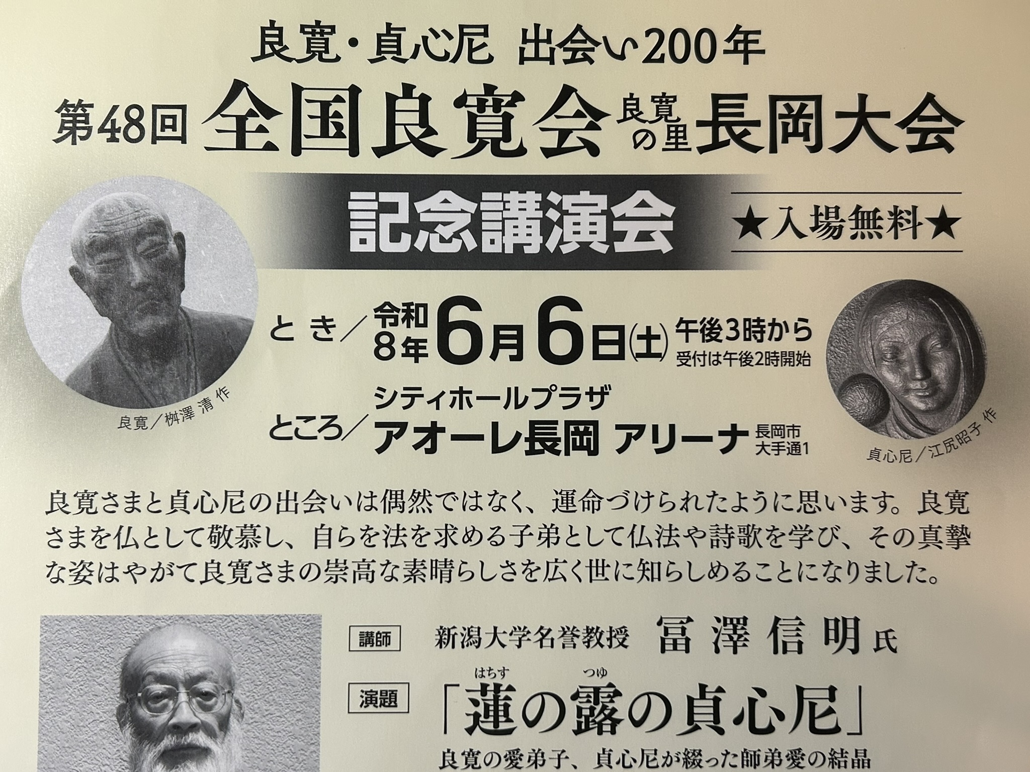 全国良寛会の成功を誓って新年会! 今年6月6日いよいよ「全国良寛会長岡大会」が長岡で開催されます。 そこで、長岡良寛の会の会員一同が、長岡大会開催総決起大会と銘打った新年会を2月22日に、約50名のメンバーが柏亭で開催に集いました。 挨拶を求められた私は、「長岡市と和島村との合併は良寛と貞心尼との出会いを象徴するもので意義深いものだった。」と述べさせていただきました。 共有: X で共有 (新しいウィンドウで開きます) X Facebook で共有 (新しいウィンドウで開きます) Facebook いいね:いいね 読み込み中… ―関連記事― 住民の手で整備が進む良寛ゆかりの「はちすば通り」 好評開催中!「良寛さんに親しむ展」 「良寛さんに親しむらんまんの集い」でナカドマでの公開囲碁対局に出場 盛会だった凡聖庵会越後地区茶会! 長岡良寛の会主催の「手まり茶会」に参加!